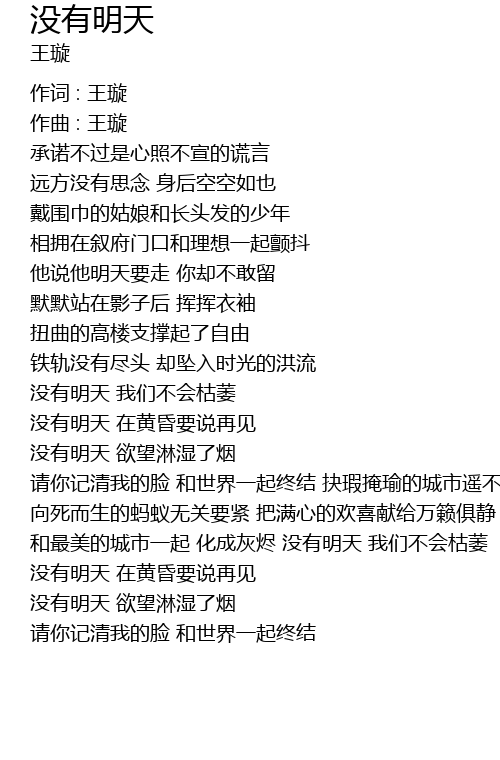 | qǐng nǐ jì qīng wǒ de liǎn hé shì jiè yì qǐ zhōng jié jué xiá yǎn yú de chéng shì yáo bù kě jí xiàng sǐ ér shēng de mǎ yǐ wú guān yào jǐn bǎ mǎn xīn de huān xǐ xiàn gěi wàn lài jù jìng hé zuì měi dí chéng shì yì qǐ huà chéng huī jìn méi yǒu míng tiān wǒ men bú huì kū wěi | |
