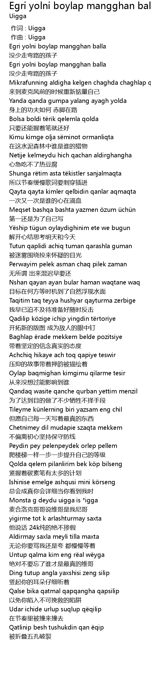 | [00:13.339] | Egri yolni boylap mangghan balla |