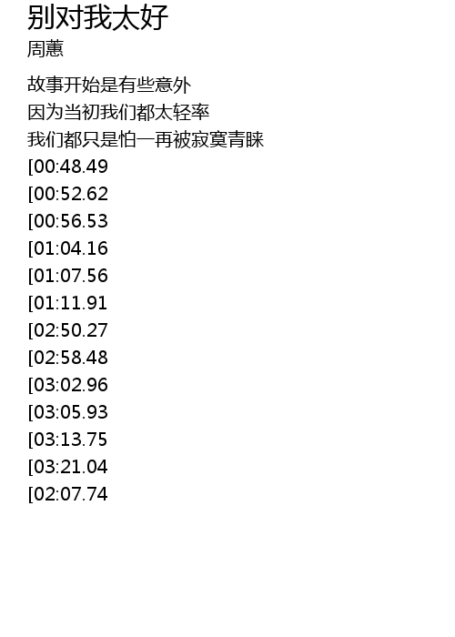 | [03:41.58][03:05.93][01:39.61] | 别对我太好 给那些承诺其实你做不到 |