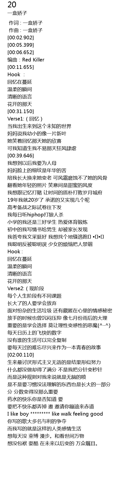| [00:58.868] | 19年我就20岁了 承诺的又实现几个呢 |