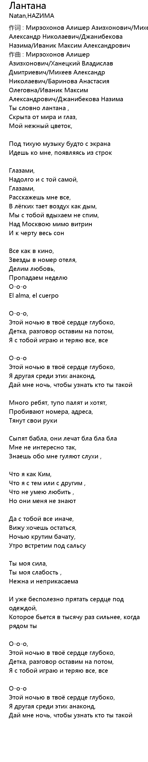 作词 : Мирзохонов Алишер Азизхонович/Михеев Александр Николаевич/Джанибекова Назима/Иваник Максим Александрович |