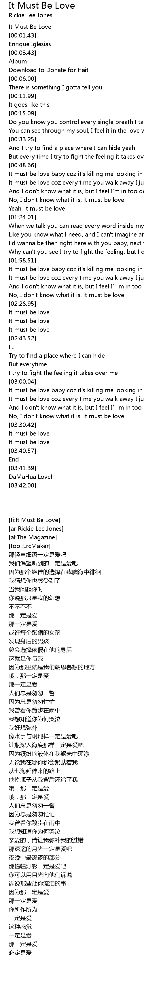 | [00:50.96] | It must be love baby coz it's killing me looking in your eyes |