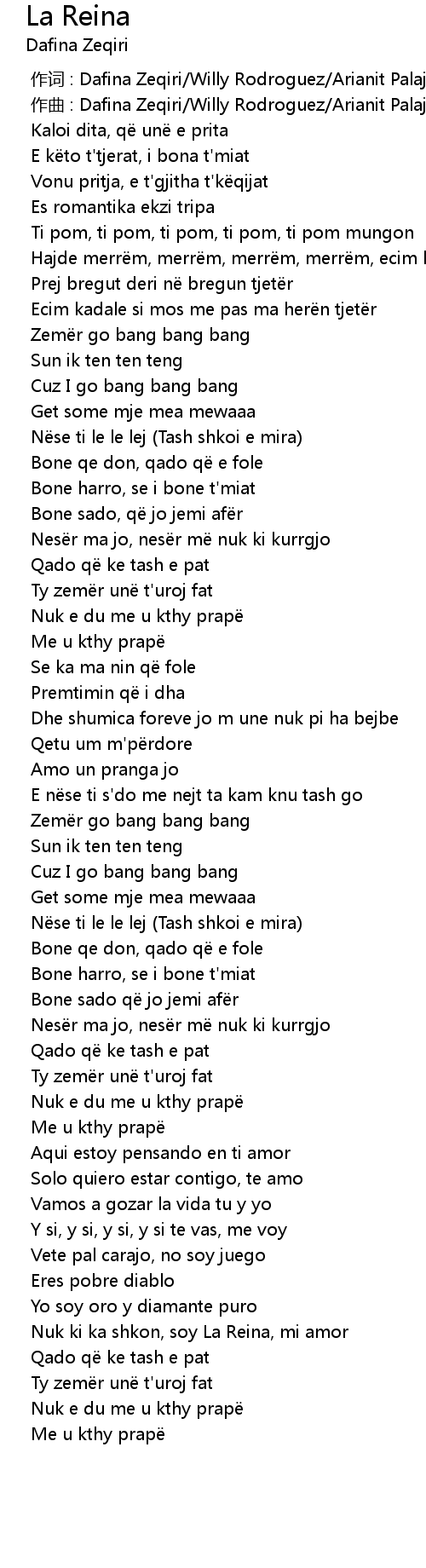 | [02:34.546] | Nuk ki ka shkon, soy La Reina, mi amor |