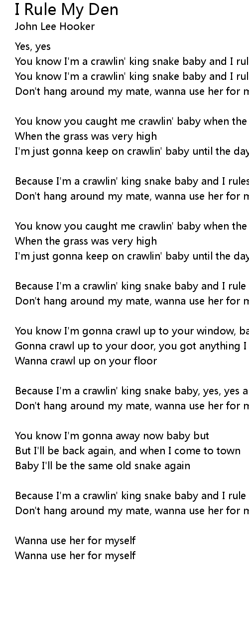 Because I'm a crawlin' king snake baby, yes, yes and I rule my den