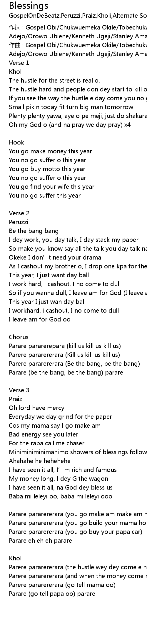 | 作词 : Gospel Obi/Chukwuemeka Okile/Tobechukwu Victor Okoh/Praise Ugbede Adejo/Orowo Ubiene/Kenneth Ugeji/Stanley Amaze | |