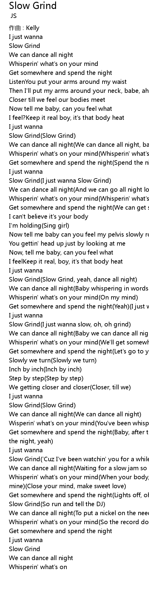 | Get somewhere and spend the night Lights off, oh, let' s slow grindI just wanna Slow Grind So run and tell the DJ | |