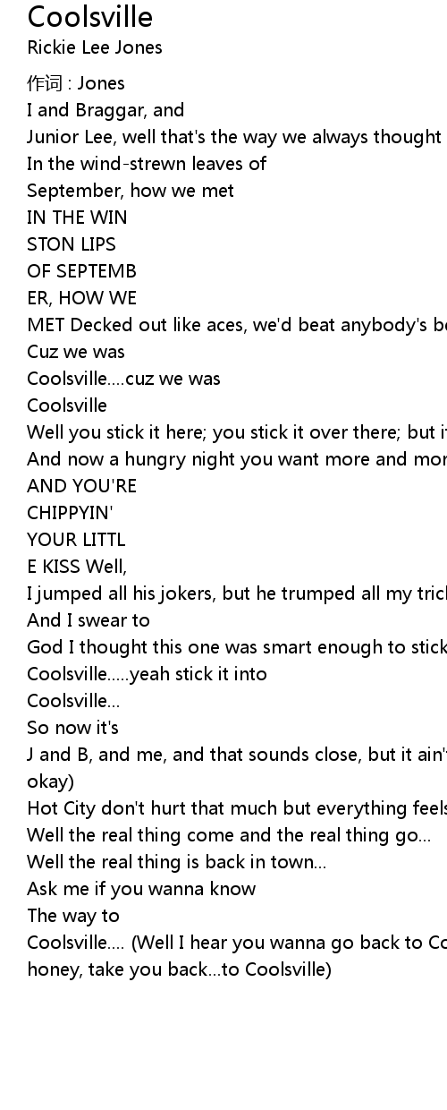 | Coolsville.... Well I hear you wanna go back to Coolsville... Well come on honey, take you back... to Coolsville |