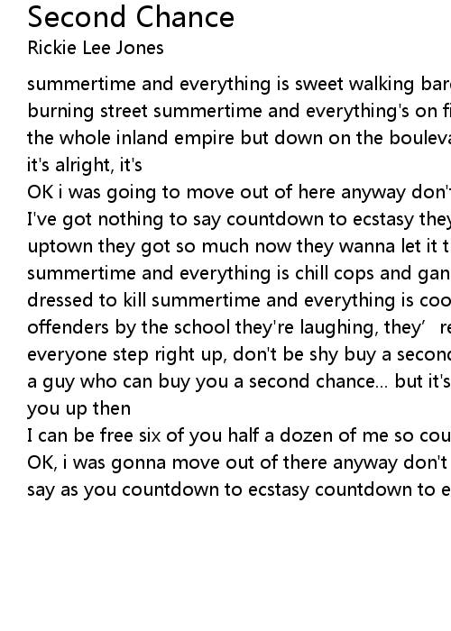 | I' ve got nothing to say countdown to ecstasy they are very rich, those boys uptown they got so much now they wanna let it trickle down la la la la la la summertime and everything is chill cops and gangsters cruising everybody' s dressed to kill summertime and everything is cool in the halfway house for sex offenders by the school they' re laughing, they' re dancing they' re calling everyone step right up, don' t be shy buy a second chance you need a favor? i got a guy who can buy you a second chance... but it' s alright with me if they lock you up then | |