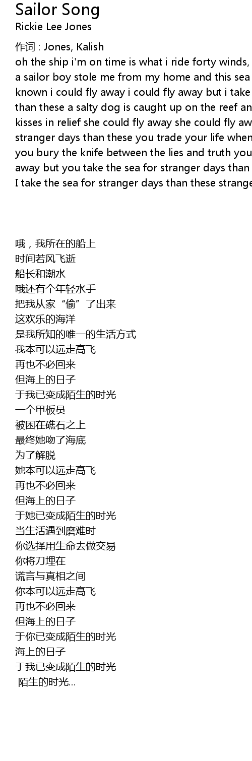 | oh the ship i' m on time is what i ride forty winds, the captain and the tide oh a sailor boy stole me from my home and this sea of joy is the only life i' ve known i could fly away i could fly away but i take the sea for stranger days than these a salty dog is caught up on the reef and the bottom of the sea she kisses in relief she could fly away she could fly away but she takes the sea for stranger days than these you trade your life when something comes for you and you bury the knife between the lies and truth you could fly away you could fly away but you take the sea for stranger days than these and | |