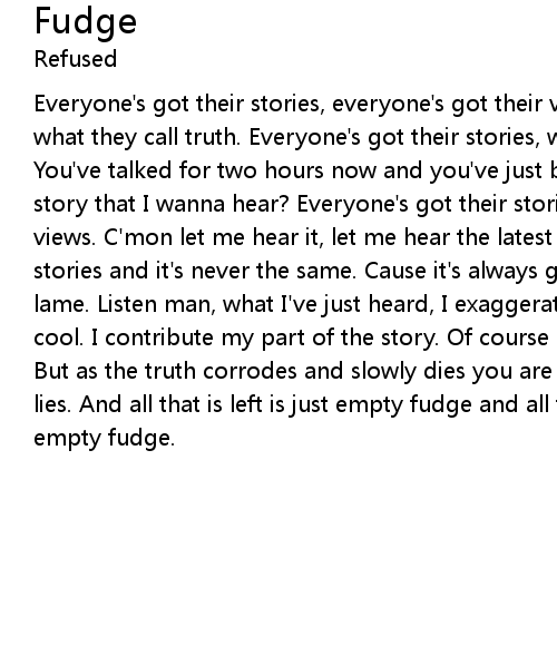Everyone's got their stories, everyone's got their view. Distorted visions of what they call truth. Everyone's got their stories, why don't you tell me one. You've talked for two hours now and you've just begun. Why don't you tell me a story that I wanna hear? Everyone's got their stories, everyone's got their views. C'mon let me hear it, let me hear the latest news. Everyone's got their stories and it's never the same. Cause it's always getting better, never getting lame. Listen man, what I've just heard, I exaggerated and now it's twice as cool. I contribute my part of the story. Of course it happened, I ain't no fool. But as the truth corrodes and slowly dies you are building yourself a world of lies. And all that is left is just empty fudge and all that is left is just empty fudge. |