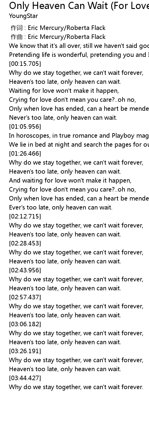 | [03:36.182] | Heaven' s too late, only heaven can wait. |