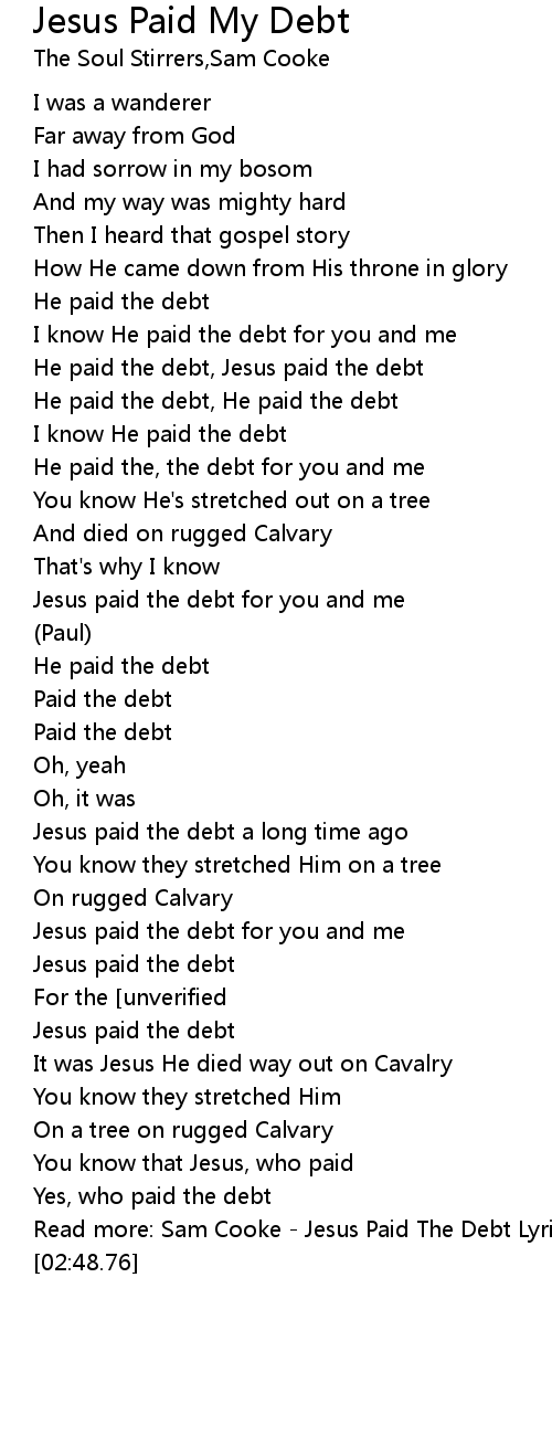 Read more: Sam Cooke - Jesus Paid The Debt Lyrics | MetroLyrics |