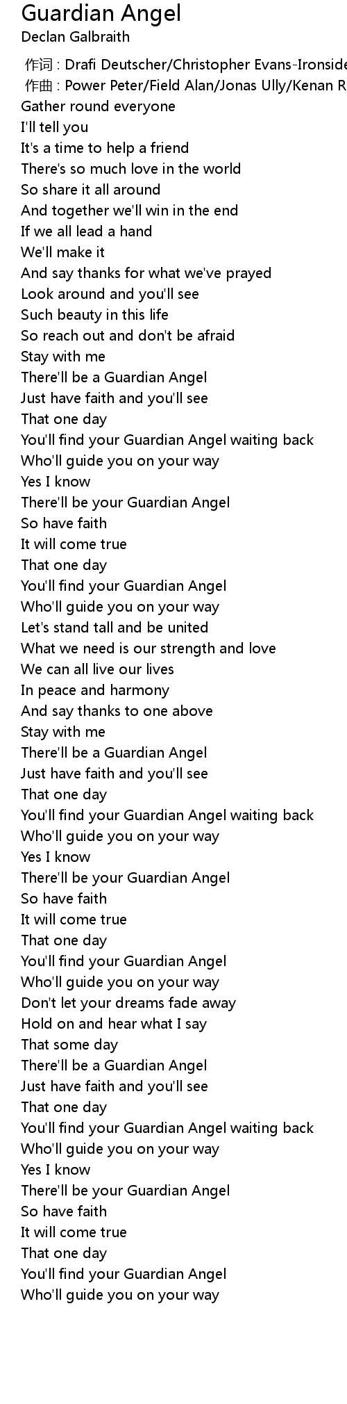 | [01:13] | You'll find your Guardian Angel waiting back |