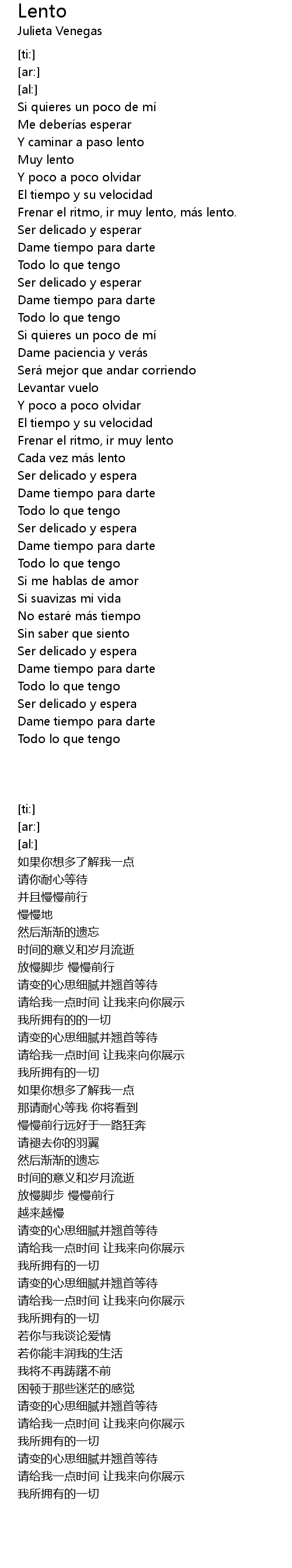 | [00:41.16] | Frenar el ritmo, ir muy lento, ma s lento. |
