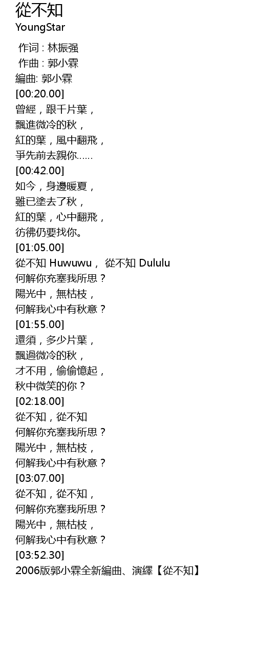 | [03:58.30] | 2006版郭小霖全新編曲、演繹【從不知】 |