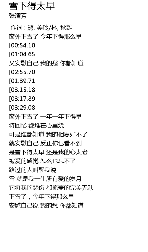 | [04:47.89][02:55.70][01:27.03] | 雪下得太早 被热泪融化了 |
