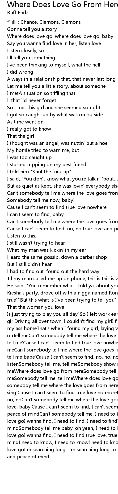 | Is just trying to play you all day" So I left work early, trying catch this girlDriving all over town, I couldn' t find my girlI finally gave up, and I took my ass homeThat' s when I found my girl, laying with Ronnie, they was getting it onTell meCan' t somebody tell me where the love goes from hereSomebody tell me, tell me' Cause I can' t seem to find true love nowhereNowhere, nowhere, no, tell meCan' t somebody tell me where the love goes from hereSomebody tell me babe, tell me babe' Cause I can' t seem to find, no, no, noTrue love and peace of mind, listenSomebody tell me, tell meSomebody show me, show meSomebody tell me, tell meWhere does love go from hereSomebody tell me, tell meSomebody show me, show meSomebody tell me, tell meWhere does love go from here, somebody sing itCan' t somebody tell me where the love goes from hereI need to know, I need to know, sing' Cause I can' t seem to find true love no moreI can' t seem to find true love, no, noCan' t somebody tell me where the love goes from hereI wanna find true love, baby' Cause I can' t seem to find, I can' t seem to find, noTrue love and peace of mindCan' t somebody tell me, I need to knowSomebody show me, where does love goI wanna find, I need to find, I need to findTrue love and peace of mindSomebody tell me baby, oh yeah, I need to knowI need to know, where does love goI wanna find, I need to find true love, true loveTrue love and peace of mindI need to know, I need to knowI need to know, I need to know, where does love goI' m searching long, I' m searching long to findI need to find true love and peace of mind |