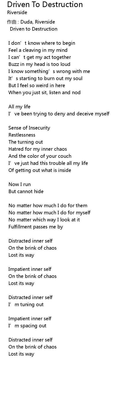 | Song | Driven To Destruction |