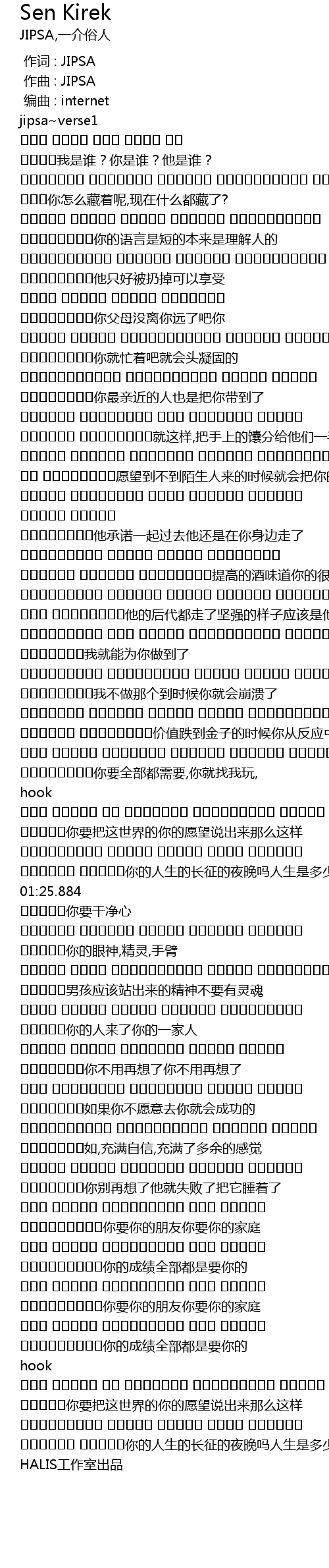 | [00:00.000]01:25.884] | سەن كىرەك پاكىز بولسۇن يۈرەك你要干净心 |