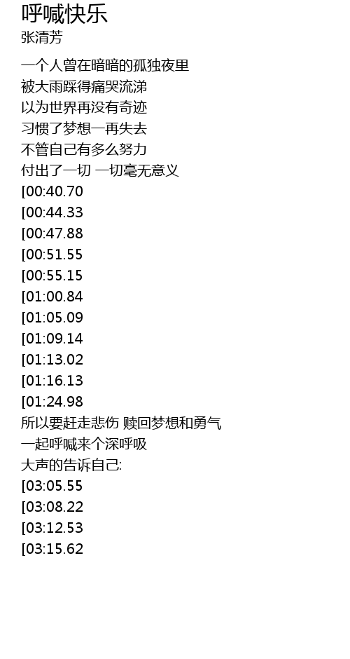 | [03:30.16][03:15.62][03:01.17] | 我快乐 Listen to me 不要太轻易放弃 |