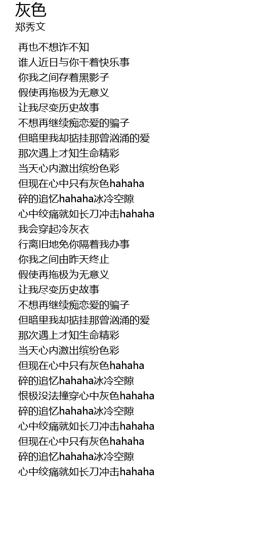 | [03:02.700] | dàn xiàn zài xīn zhōng zhǐ yǒu huī sè hahaha |