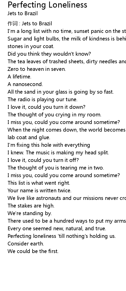 | Perfecting loneliness ' till nothing' s holding us. | |