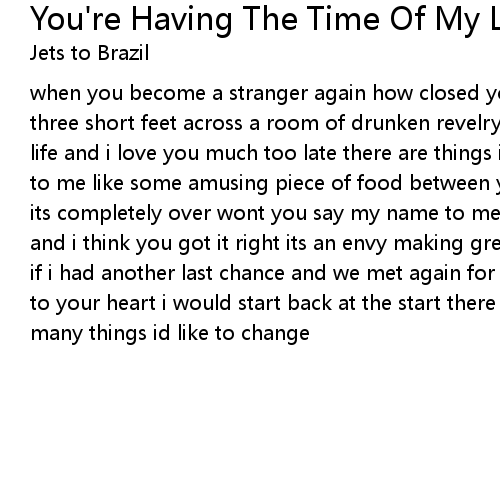 when you become a stranger again how closed your eyes will be narrowing me to three short feet across a room of drunken revelry youre having the time of my life and i love you much too late there are things id like when you say my name to me like some amusing piece of food between your teeth then i will know that its completely over wont you say my name to me youre having the time of my life and i think you got it right its an envy making green says your eyes only see me if i had another last chance and we met again for the first time i would listen to your heart i would start back at the start there are things id like to say so many things id like to change