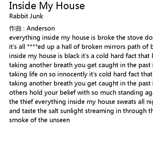 | everything inside my house is broke the stove don't work my window is cracked it's all ****ed up a hall of broken mirrors path of broken glass everything inside my house is black it's a cold hard fact that life moves so fast without taking another breath you get caught in the past i remember the boy i used to be taking life on so innocently it's cold hard fact that life moves so fast without taking another breath you get caught in the past it's of little relief that others hold your belief with so much standing against us all you're got to be the thief everything inside my house sweats all night i wake up every morning and taste the salt sunlight streaming in through the nicotine i bathe in the smoke of the unseen |