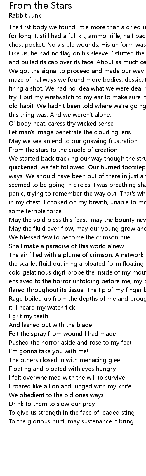 The first body we found little more than a dried up husk. It hadn't been there for long. It still had a full kit, ammo, rifle, half pack of cigarettes in the chest pocket. No visible wounds. His uniform was unfamiliar, not one of ours. Like us, he had no flag on his sleeve. I stuffed the cigarettes into my pocket and pulled its cap over its face. About as much ceremony as any of us deserved. We got the signal to proceed and made our way deeper into the structure. In the maze of hallways we found more bodies, dessicated, no wounds. All dead without firing a shot. We had no idea what we were dealing with. We weren't the first to try. I put my wristwatch to my ear to make sure it was still ticking. It's an old habit. We hadn't been told where we're going or why. We had no idea how big this thing was. And we weren't alone. |