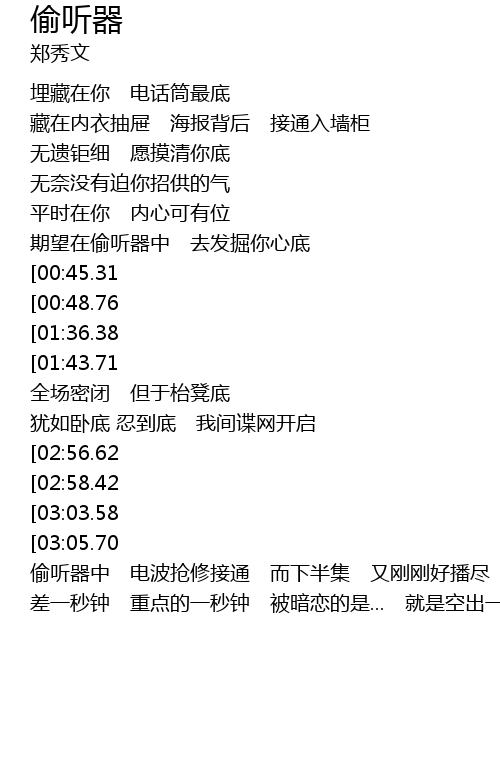 | [02:23.66][01:36.38][00:52.79] | 偷听器中 未清楚收到风 提及我吧 未想轻举妄动 |