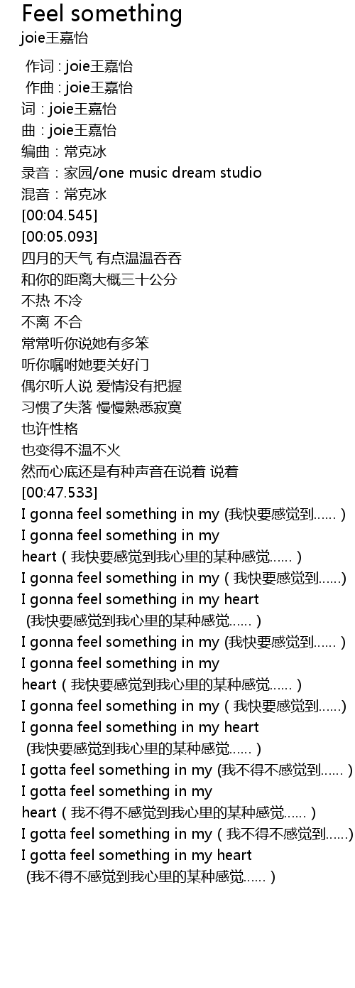 | [01:34.132] | I gonna feel something in my heart wǒ kuài yào gǎn jué dào wǒ xīn lǐ de mǒu zhǒng gǎn jué |