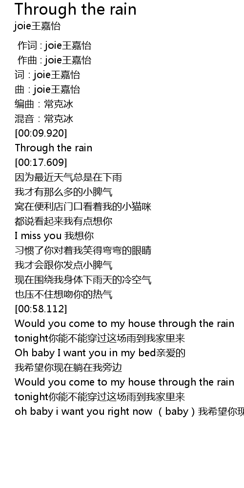 | [01:00.060] | Would you come to my house through the rain tonight你能不能穿过这场雨到我家里来 |