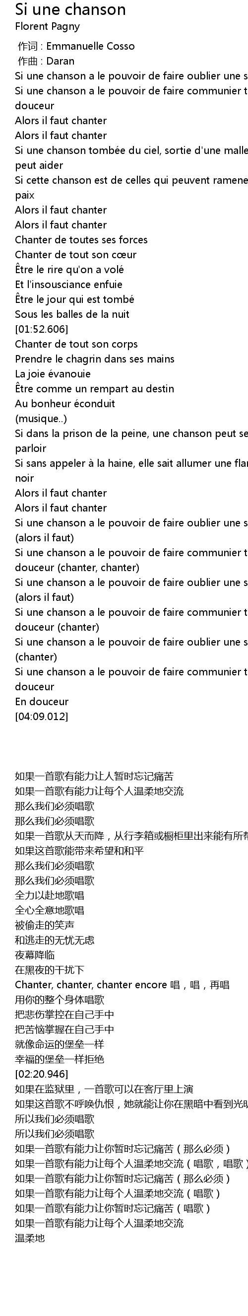 | [00:56.724] | Si une chanson tombé e du ciel, sortie d' une malle ou d' une armoire peut aider |