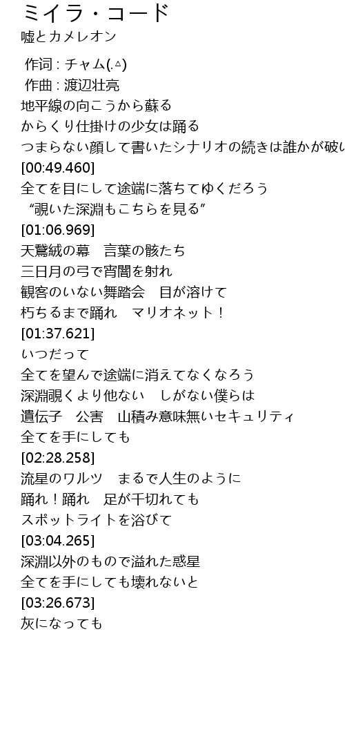 | [01:28.492] | 観客のいない舞踏会 目が溶けて |