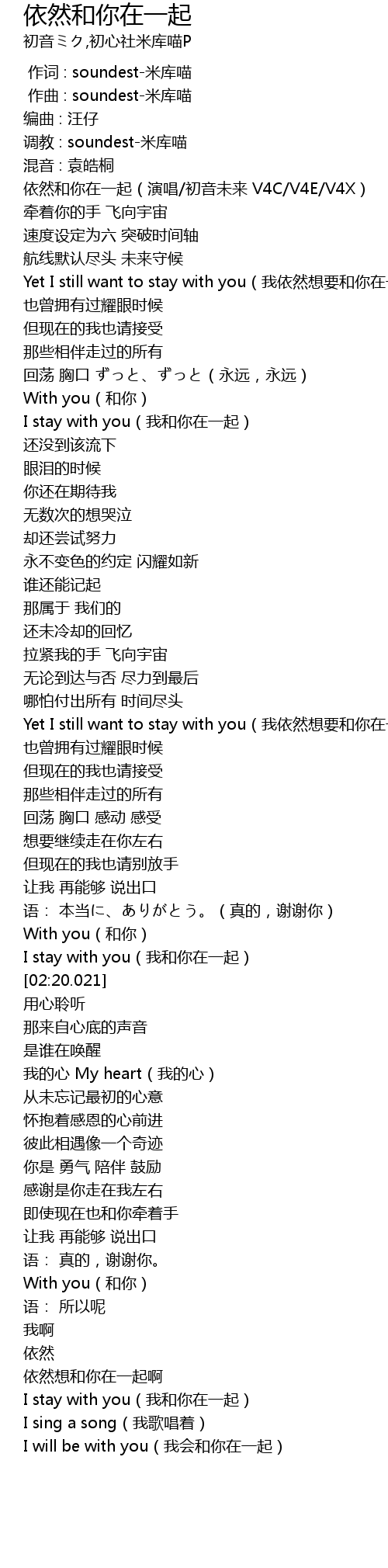 | [00:00.500] | 依然和你在一起(演唱/初音未来 V4C/V4E/V4X) |