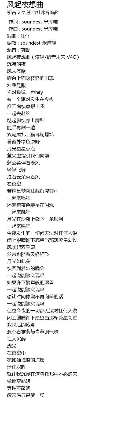 | [00:00.500] | 风起夜想曲(演唱/初音未来 V4C) |