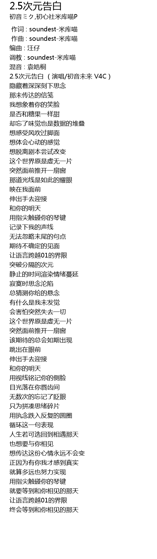 | [00:00.500] | 2.5次元告白 (演唱/初音未来 V4C) |