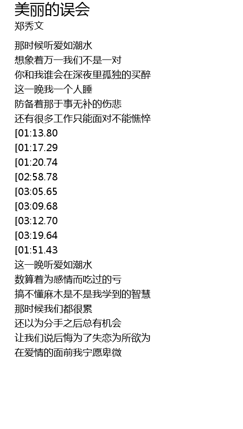 | [03:48.03][03:12.70][01:40.91] | 我牵的手伤的心流的泪是不是浪漫的误会 |