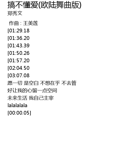 | [01:13.16][01:57.20][02:11.87][02:45.00][02:59.77] | 搞不懂爱 我不明白 |