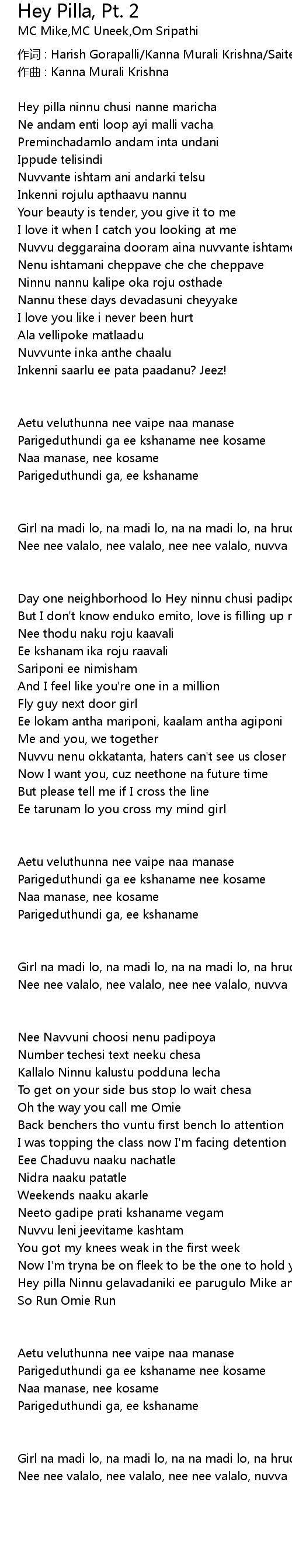 | 作词 : Harish Gorapalli/Kanna Murali Krishna/Saiteja Sripathi | |