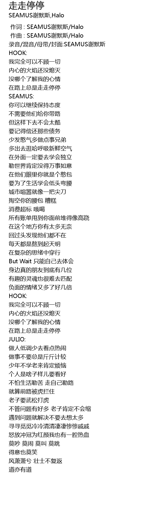 | [02:14.945] | zài lù shàng zǒng shì zǒu zǒu tíng tíng |
