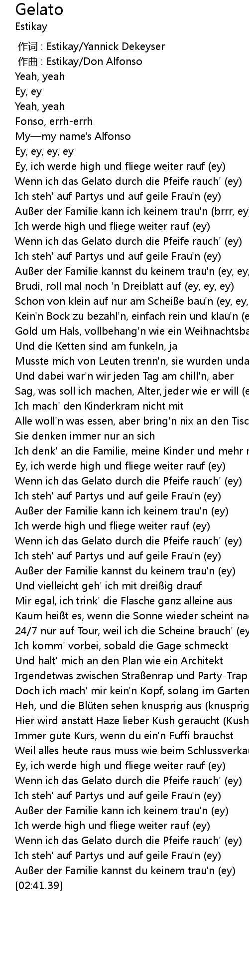 | [02:19.86] | Wenn ich das Gelato durch die Pfeife rauch' (ey) |
