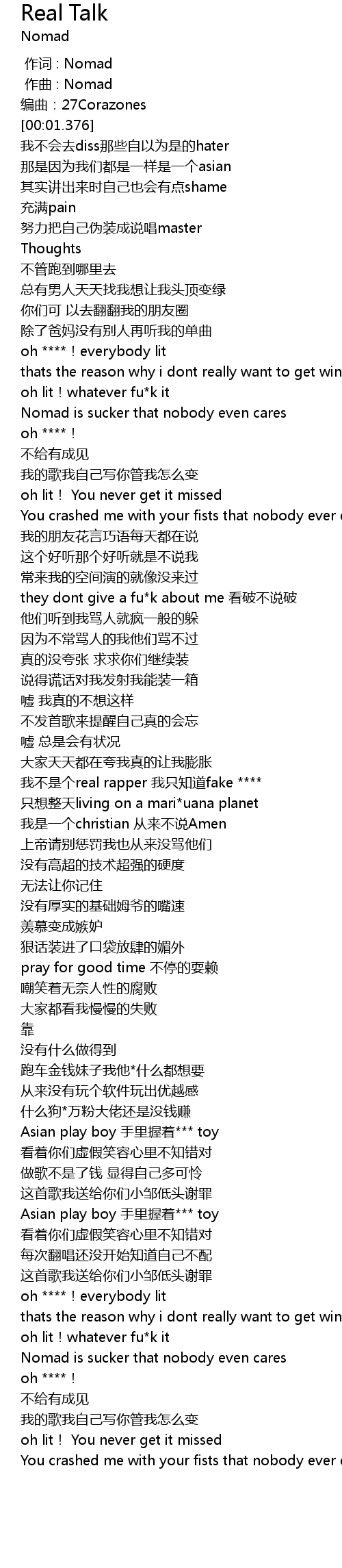 | [01:25.780] | 我不是个real rapper 我只知道fake **** |