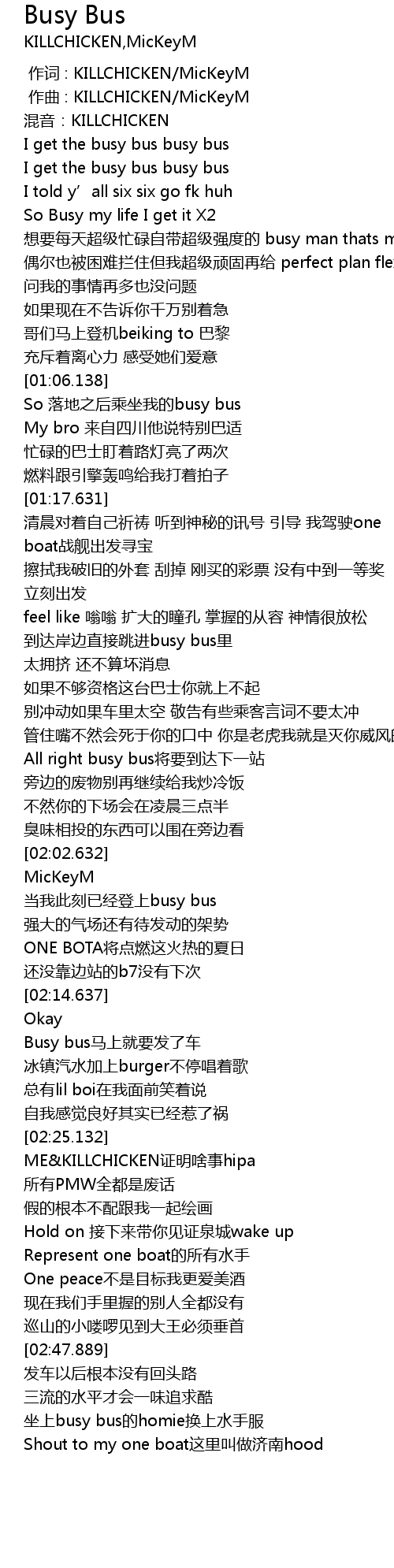 | [02:04.387] | 当我此刻已经登上busy bus |