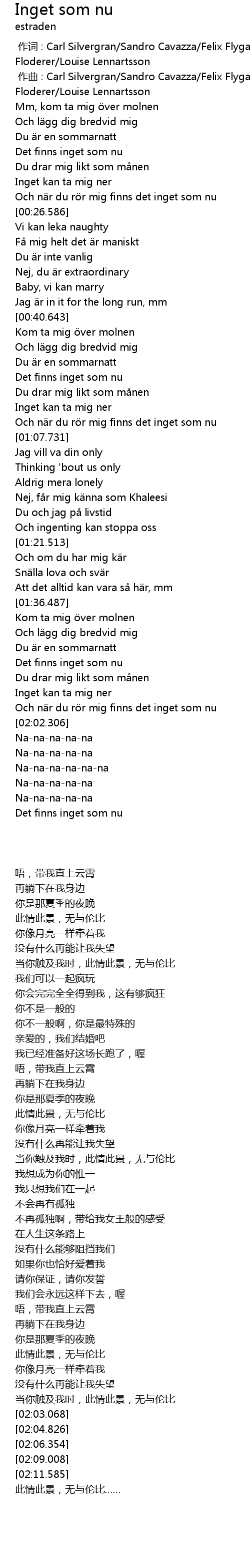 | [00:00.303] | zuo qu : Carl Silvergran Sandro Cavazza Felix Flygare Floderer Louise Lennartsson |