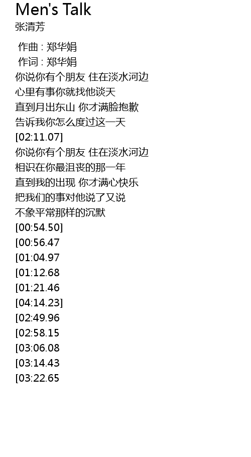 | [03:38.71][02:58.15][01:36.87] | ni men jiao ta zuo dan shui he bian de Men' s Talk |