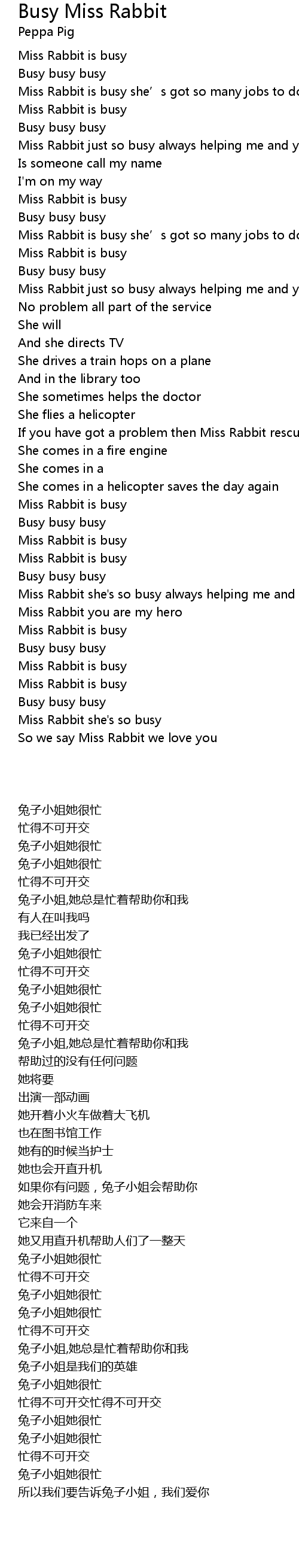 | [00:45.78] | Miss Rabbit just so busy always helping me and you |