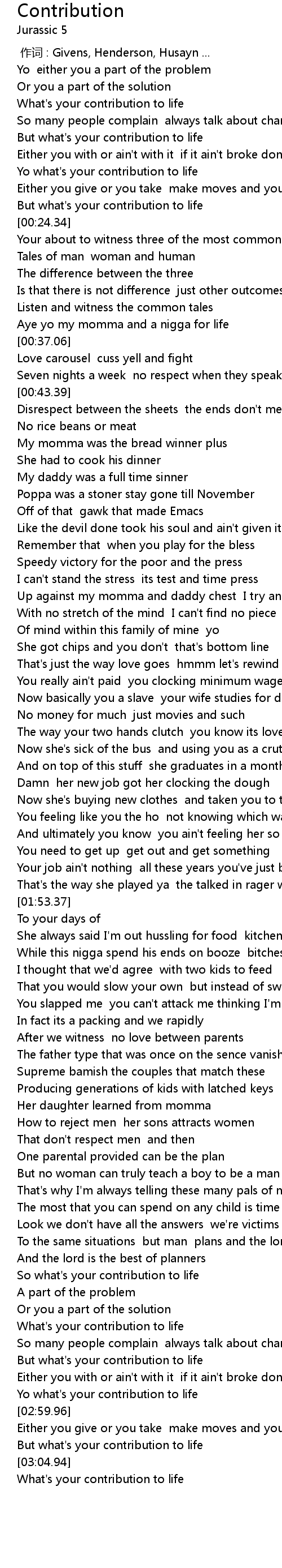 | [02:57.90] | Yo what's your contribution to life |