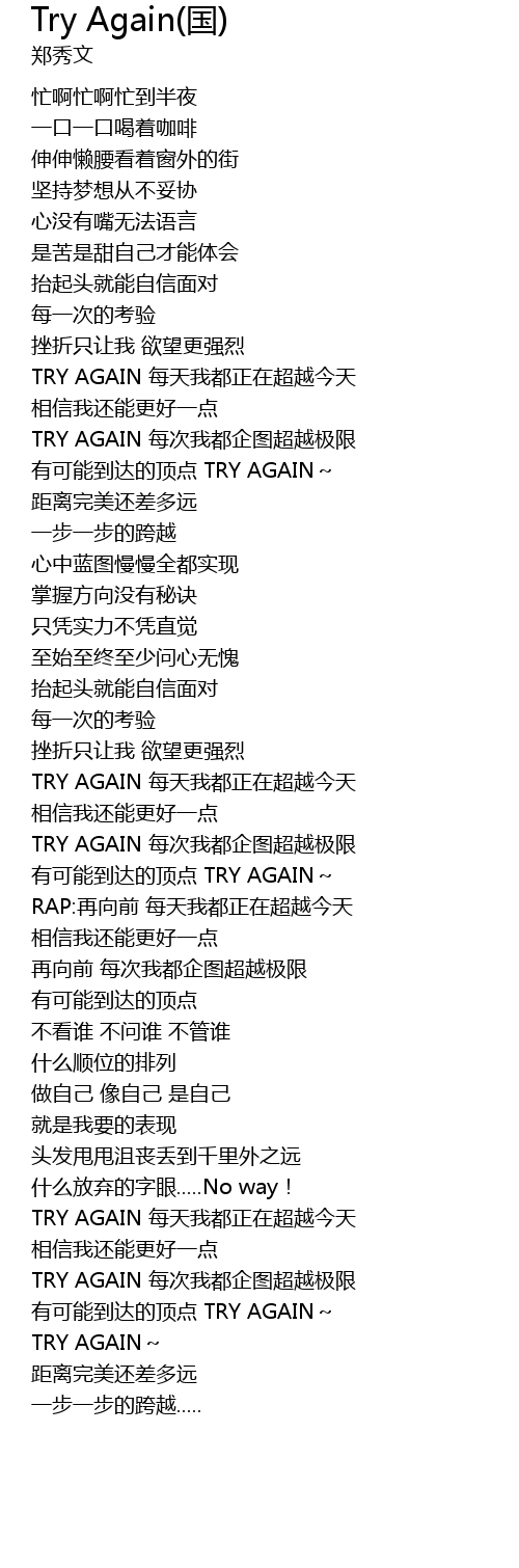 | [00:59.44] | TRY AGAIN měi tiān wǒ dōu zhèng zài chāo yuè jīn tiān |