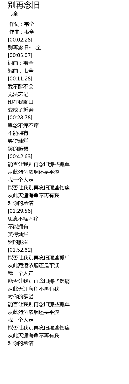 | [00:03.54] | 别再念旧-韦全 |